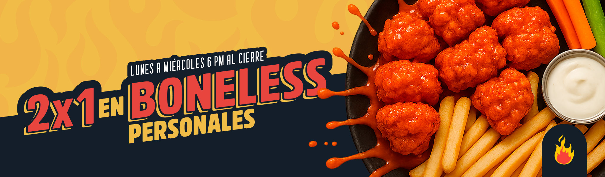 Aplica 2 platillos iguales a precio de uno en la compra de boneless personales. Valido únicamente de lunes a miércoles de 6:00 pm al cierre de la sucursal de Aguascalientes y León. No aplica con otras promociones, cupones o descuentos, solo válida en comedor, vigencia del 1ro de enero del 2025 al 31 de enero 2026 o hasta agotar existencias. Aplican restricciones.