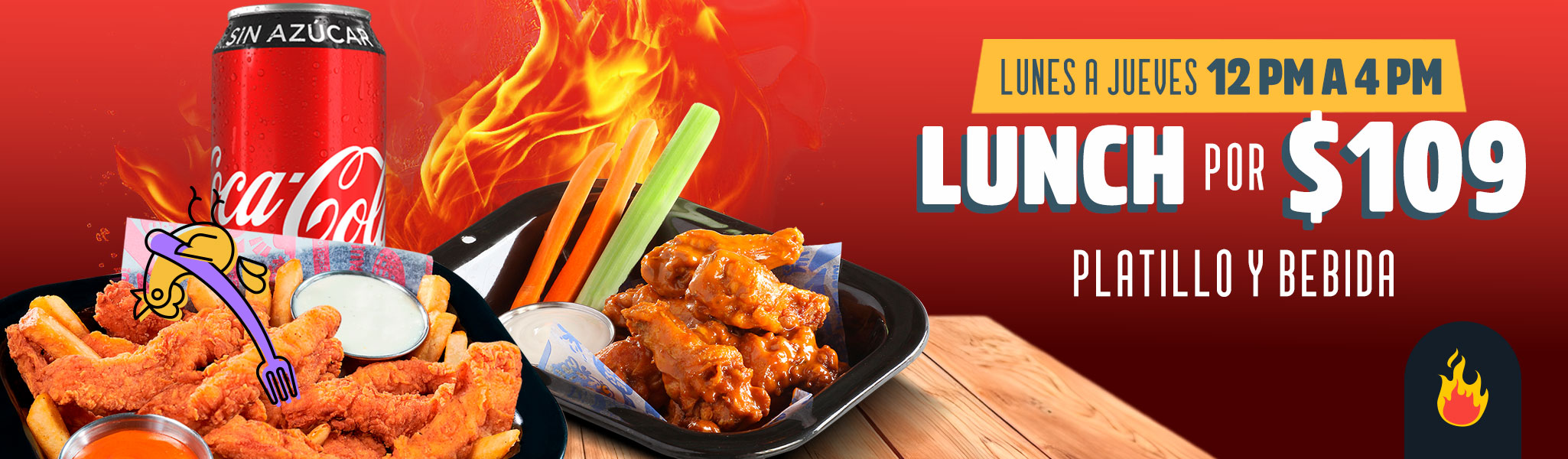 Lunch por $109 Platillo y Bebida. Elige entre ½ pocho salad, 1/2 ensalada de mi jefa, stripper snack, boneless snack más bebida (no refill). Consumo en comedor de lunes a jueves de 12:00 a 4:00 p.m. en todas las sucursales de Cd. Juárez y Chihuahua, hasta agotar existencias.