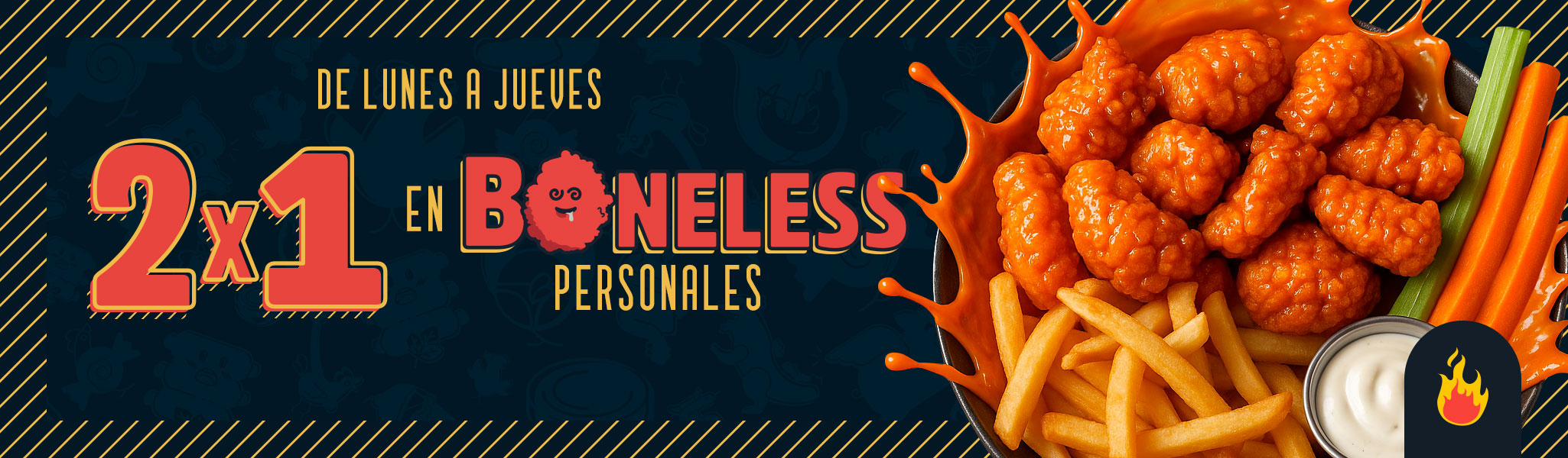 IMPORTANTE: La promoción aplica en el primer platillo de Boneless Personales, los refiles posteriores son Boneless Snack sin papas fritas ni aderezos. La promoción es válida en consumo individual en un lapso de servicio no mayor a 2 horas a partir de que se abre la cuenta. No aplica con bebidas refiles, ni con otros cupones, promociones, ni descuentos. No aplica para llevar ni en apps de delivery. Las Alitas se reserva el derecho de modificar o cancelar esta promoción en cualquier momento, sin previo aviso.