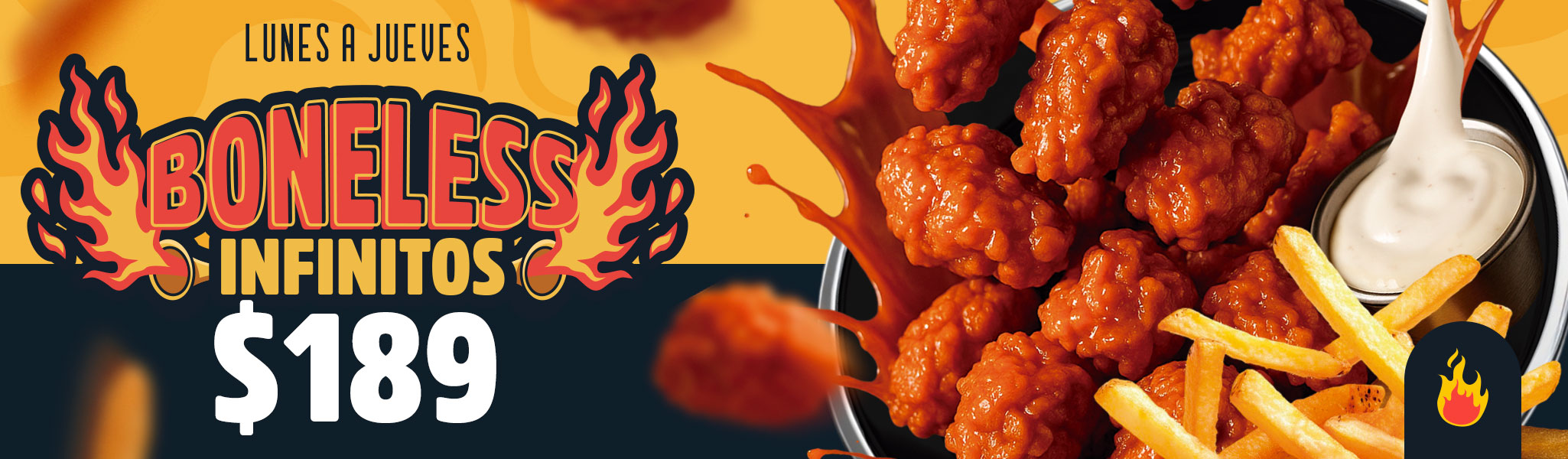 Todos los boneless que puedas comer por $189.00 pesos. Válido exclusivamente en el comedor de Las Alitas de Lunes a Jueves del 25 de Agosto al 31 de Enero de 2026, o hasta agotar existencias. Válido únicamente en las sucursales de Las Alitas de Condesa, Cosmopol, MAQ, Vía Vallejo, Aeropuerto, Centro, Citadel, Concordia, Paseo 727, Paseo La Fe, Santa Catarina, Sendero La Fe, Galerías Metepec, Galerías Toluca, Sendero Toluca en Nuevo León, Ciudad de México y Estado de México.