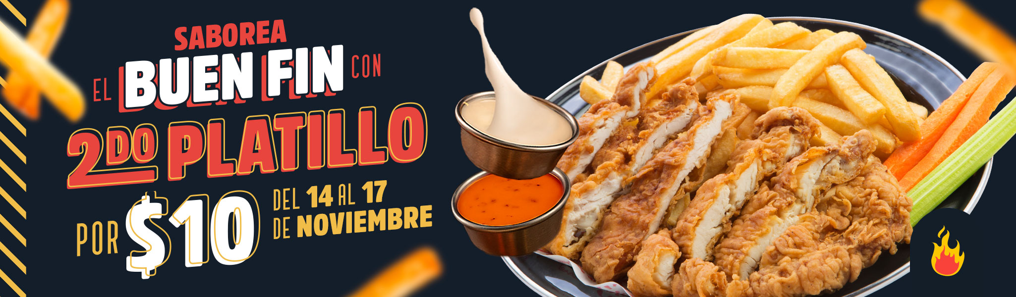 En la compra de una platillo de adulto: Boneless Personales/Alitas Personales, Strippers Clásicos, Hamburguesa Clásica, llévate el segundo platillo (puede ser Boneless Personales/Alitas Personales, Strippers Clásicos o Hamburguesa La Clásica) por $10.00 pesos. Válido en Comedor de Las Alitas de Viernes 14, Sábado 15, Domingo 16, Lunes 17 de Noviembre de 2025 o hasta agotar existencias en sucursales de Ciudad de México, Estado de México y Nuevo León. No aplica con otros cupones, promociones ni descuentos ni productos no mencionados. No aplica para llevar ni servicio delivery. Para hacer válida la promoción, se cobrará el platillo de precio mayor. Promoción sujeta a disponibilidad en cada sucursal, válida por tiempo limitado o hasta agotar existencias. Las Alitas se reserva el derecho de modificar o cancelar esta promoción en cualquier momento, sin previo aviso.