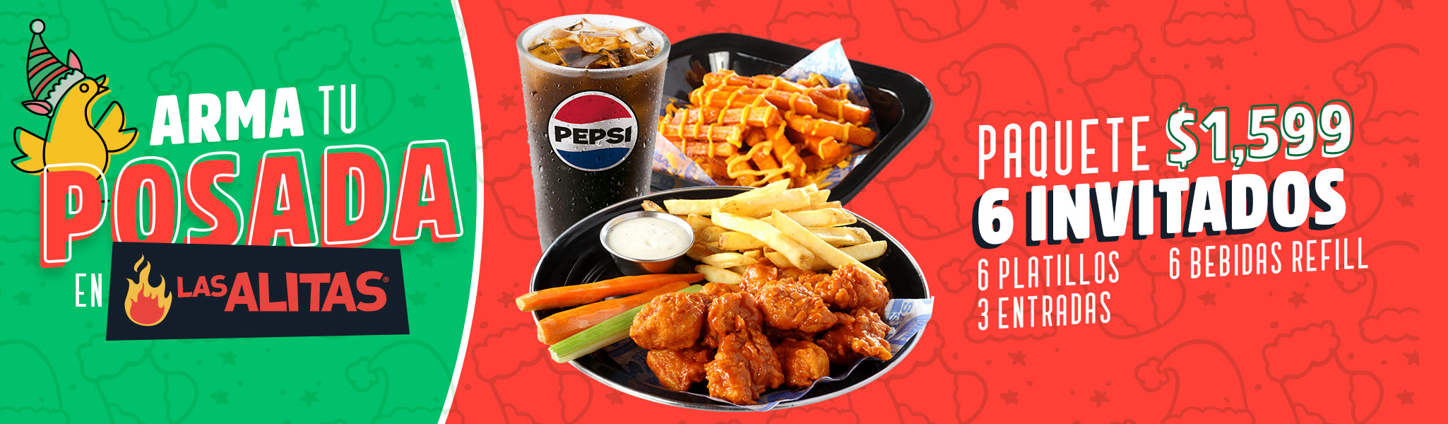 Válido en Comedor de Las Alitas, de Lunes a Domingo hasta el 31 de Diciembre de 2025 o hast agotar existencias en sucursales de Ciudad de México, Estado de México y Nuevo León. No aplica con otros cupones, promociones ni descuentos. No aplica para llevar ni en apps de delivery. Las Alitas se reserva el derecho de modificar o cancelar esta promoción en cualquier momento, sin precio aviso.