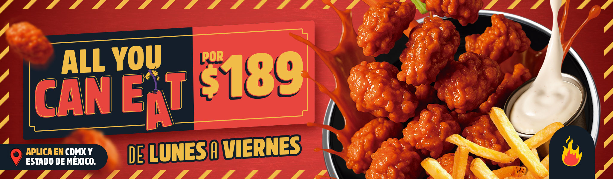 Todos los Boneless* que puedas comer por $189.00 pesos. Promoción exclusiva de Lunes a Viernes desde el horario de apertura hasta el horario de cierre, hasta el Miércoles 01 de Julio 2026, o hasta agotar existencias, exclusivo para consumo en comedor.