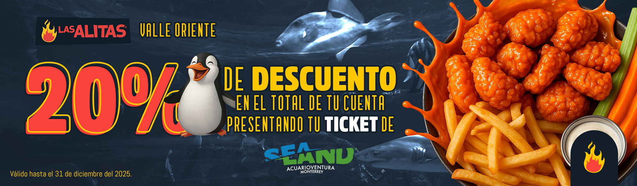 Promoción válida únicamente en la sucursal Las Alitas Valle Oriente y Las Alitas Condesa presentando ticket o pase de expedición vigente del Acuario Sealand o Acuario Inbursa. Válido del 24 de septiembre al 31 de diciembre del 2025. Descuento del 20% aplicable en consumo de alimentos y bebidas. No aplica con otras promociones, descuentos ni beneficios no especificados.