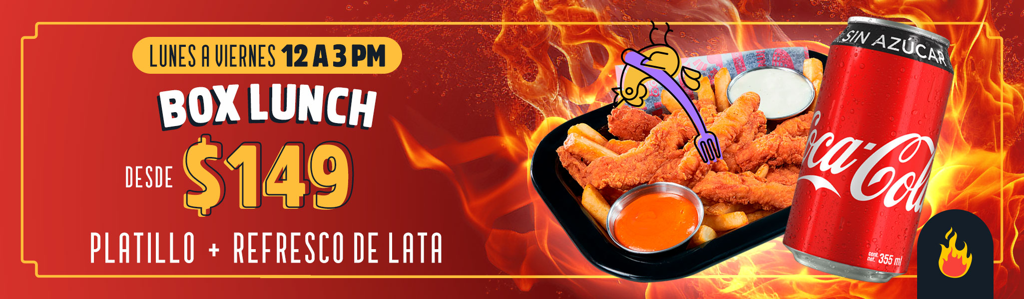 Lunch por $149 platillo más refresco de lata. Elige entre 1/2 Ensalada De Mi Jefa Con Pollo, Strippers Snack, Alitas Snacks o Boneless Snack. Promoción válida para consumo en comedor de lunes a viernes de 12:00 a 3:00 p.m. No aplica para llevar, con otras promociones, cupones o descuentos, en sucursal de Tuxtla Gutierrez. Vigencia del 01 de octubre al 30 de noviembre de 2025 o hasta agotar existencias.