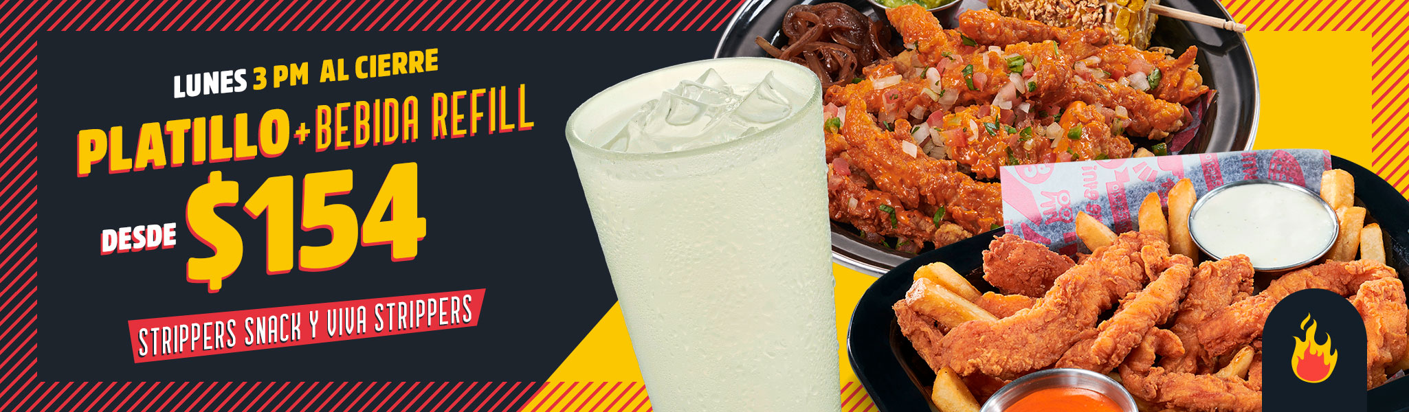 Ordena tu Stripper Snacks o Viva Strippers y obten tu bebida refill totalmente gratis. Promoción válida para consumo en comedor los días lunes de 3:00 p.m. al cierre, no aplica para llevar, con otras promociones, cupones o descuentos, en sucursal de Tuxtla Gutierrez. Vigencia del 01 de octubre al 30 de noviembre de 2025 o hasta agotar existencias.