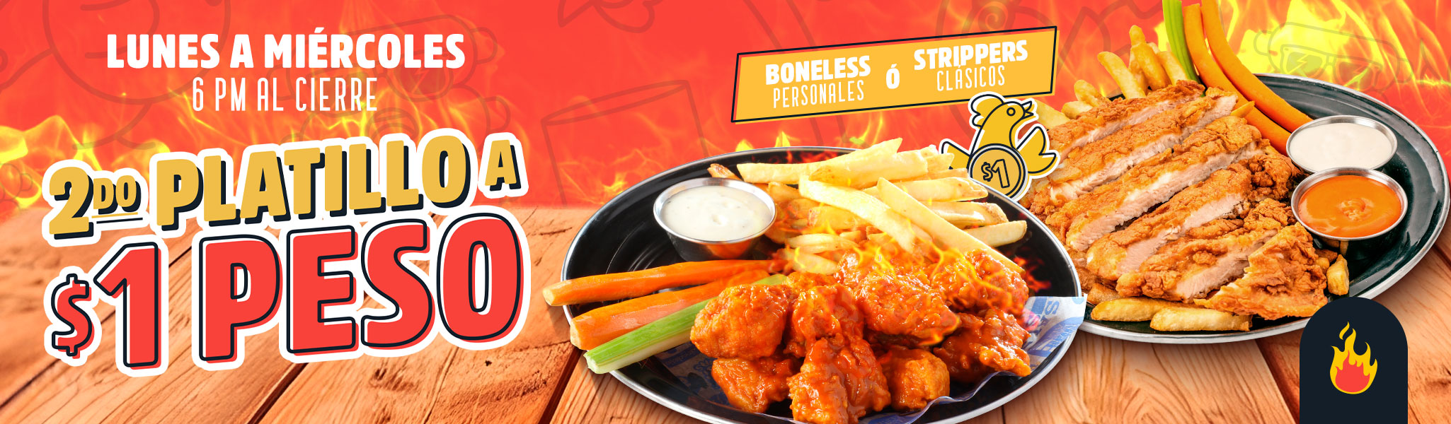 Solo aplica en platillos seleccionados boneless personales y stripper clasico. Promocion valida despues de las 6:00 pm. Solo aplica para consumo en comedor, no aplica con otras promociones, cupones o descuentos. Vigencia hasta el 31 de diembre del 2025. En ciudad victoria tamaulipas.